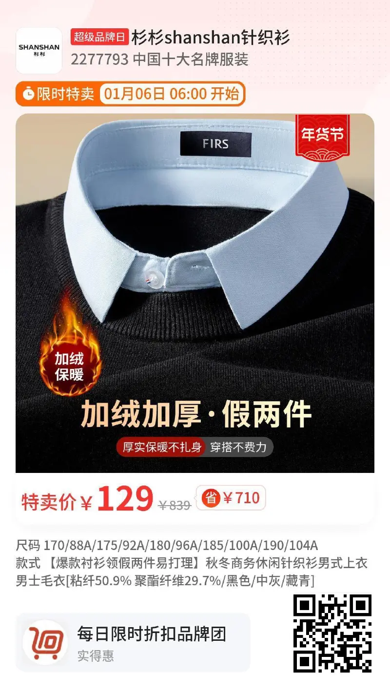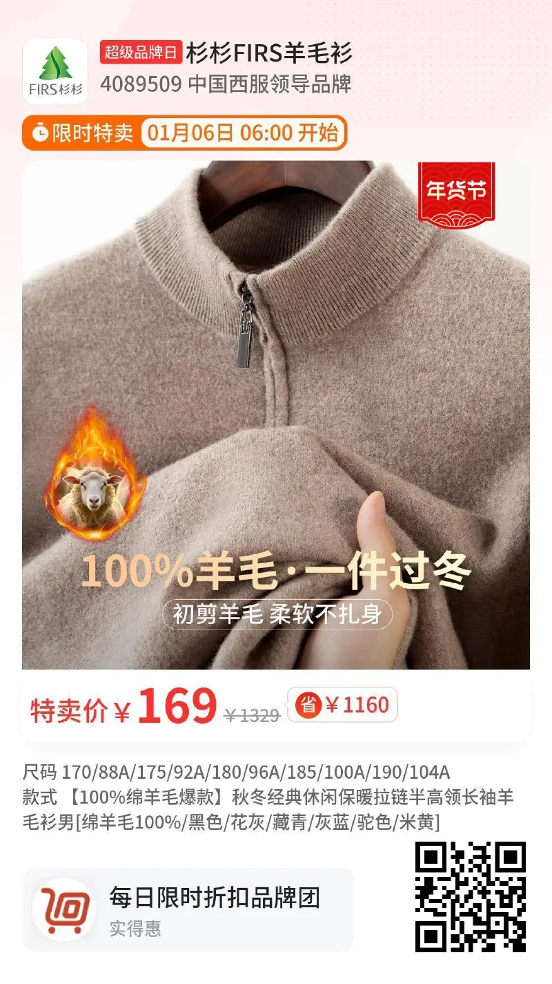 重点来了:羊毛衫原价259,现在凑单羽绒服直接参加299-80,相当于白送!黑白灰藏青四色,老爸老公都能安排。